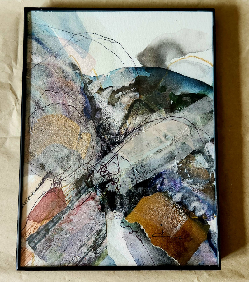 This body of work is defined by a random yet organized mix of media, such as watercolor, acrylic paint, ink, oil pastels, charcoal. Together with a curated variety of eco, organic, and manipulated papers (rice, mulberry, recycled, tissue) and “mark making”, each unique collage work reveals a charming blend of color, texture, and artistic statement. The theme and color palette is carried across these 9 pieces.